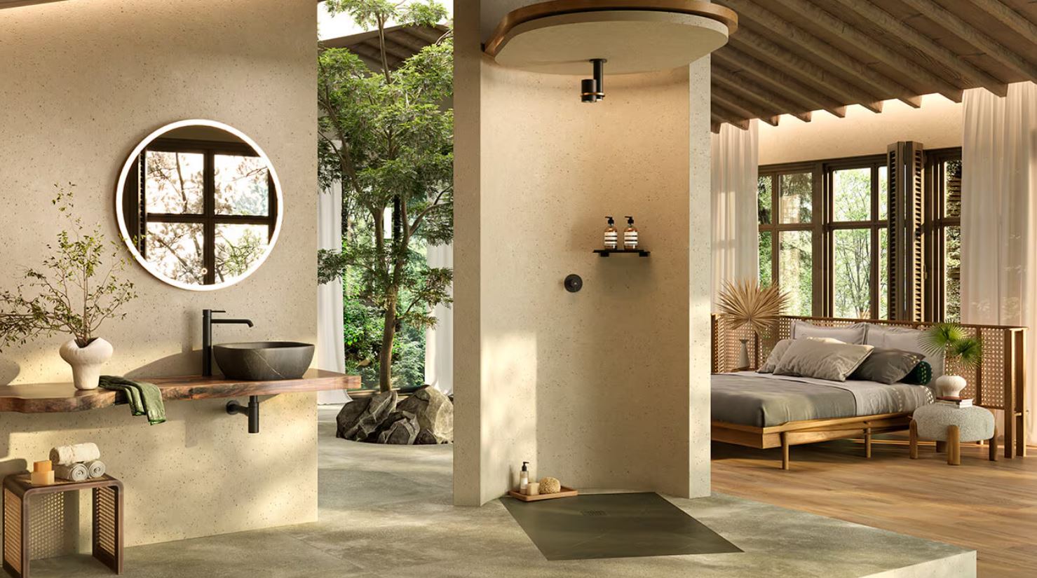 Ahelyett, hogy a hibátlan fehérség uralkodna, a bútorok, csaptelepek, szaniterek, zuhanykabinok és kiegészítők esetében is a textúrák és a finom tónusok játéka adja meg a tervezés mélységét.
